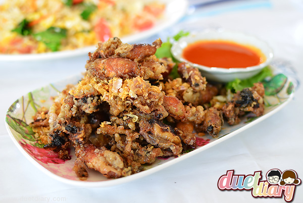 จานแรกที่เราสั่งมาชิมกันก็คือ ปลาหมึกกระตอยทอดกระเทียม ฟังชื่อแล้วเพื่อนๆอาจไม่คุ้นหู ปลาหมึกกระตอยนั้นเป็นปลาหมึกสดตัวเล็กที่นำไปตากแห้งทั้งตัว เนื้อปลาหมึกนั้นจะหอม เนื้อแน่น ที่ร้านร่มไม้เค้าจะใช้ปลาหมึกกระตอยที่สดใหม่ ด้านในนั้นยังมีถุงน้ำหมึกปลาหมึกอยู่เลยครับ เค้าจะนำลงไปทอดกับกระเทียมทั้งตัวในน้ำมันท่วมๆร้อนๆจนสุกกรอบสีสวย จิ้มทานกับซอสพริกอร่อยมากๆครับ เนื้อปลาหมึกนั้นจะกรอบนอกนุ่มใน มีความหวานสดใหม่ เป็นเมนูอร่อยที่แตกต่างจากปลาหมึกชุบแป้งทอดทั่วไปมากมายครับ