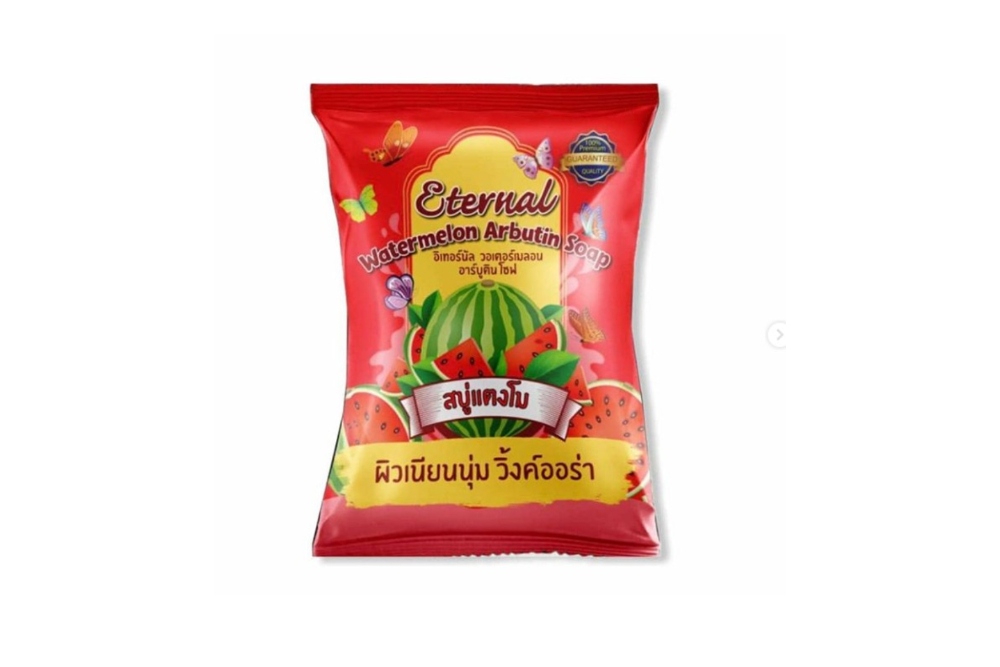 ใครที่อยากมีผิวขาวใส เรียบเนียน ดูมีออร่า เลือกใช้สบู่ Eternal Watermelon Arbutin อีกหนึ่งแบรนด์น้องใหม่ที่กำลังเป็นนิยม ราคาเบา ๆ แค่หลักสิบก็ทำให้ผิวดูวิ้งค์ออร่า ใช้ได้ทั้งผิวหน้าและผิวกาย สบู่แตงโมนี้จะมีสกัดมาจากแตงโมที่มีความเข้มข้นมาก ๆ และยังผสมวิตามิน C ที่ได้จากแตงโมธรรมชาติ จะช่วยต่อต้านอนุมูลอิสระ ให้ผิวคืนสู่สภาพเดิมมีความชุ่มชื้น ไม่แห้งกร้าน ใครผิวแห้งแนะนำให้ใช้สบู่ตัวนี้เลย นอกจากจะช่วยเรื่องความชุ่มชื้นของผิวแล้วก็ยังจะเพิ่มความออร่าให้ผิวหน้าและผิวกายมีความกระจ่างใส เปล่งปลั่งดูมีชีวิตชีวา ผิวเรียบเนียน ลดเลือนริ้วรอยและจุดด่างดำได้อีกด้วย