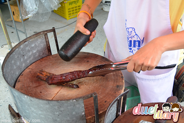 เมื่อสั่งว่าจะเอาหมูหรือเนื้อกี่ชิ้นกับแม่ค้าแล้ว เค้าก็จะนำไปทุบบนเขียง ด้วยสากครับ แม่ค้าบอกว่าต้องใช้สากของอ่างศิลาเท่านั้นนะ ไม่งั้นไม่อร่อย มีเคล็ดลับซะด้วยครับ